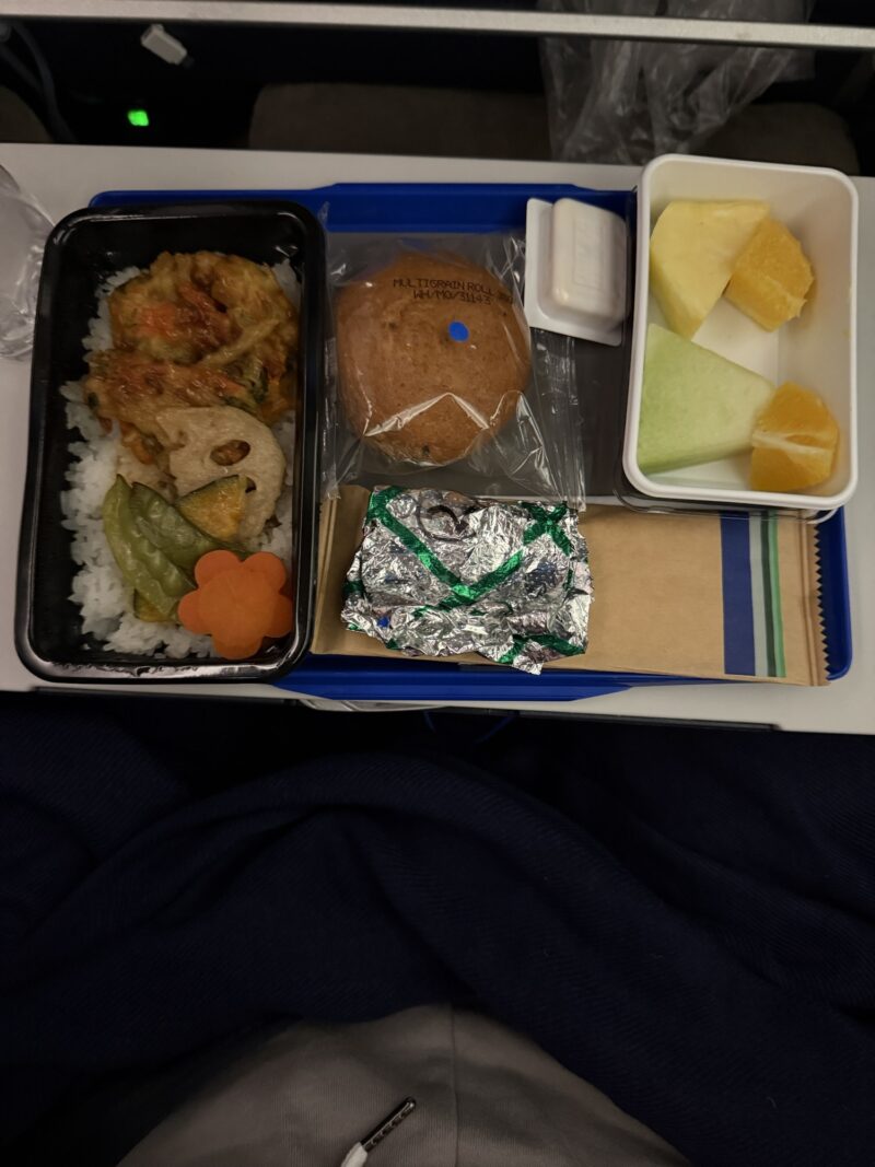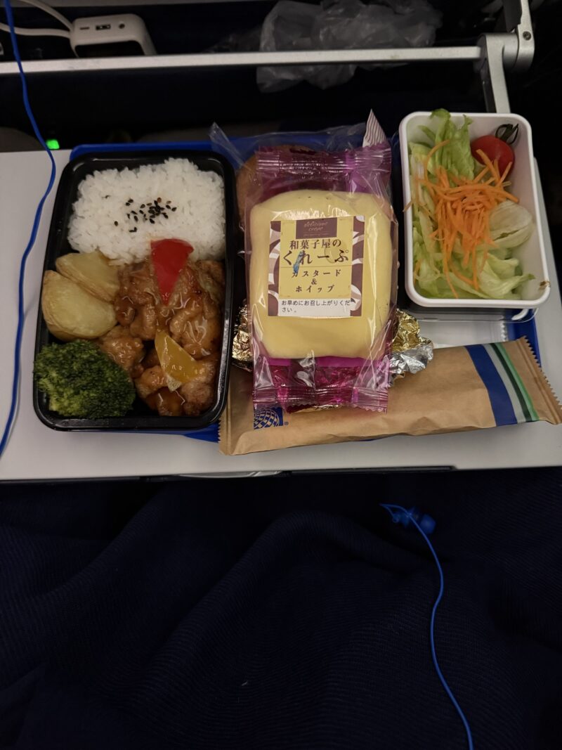 1時間半位すると、1回目の機内食がやって来ました。航空券を買った時に息子にはキッズミールをオーダーしていたので、一般食を全席に配る前に先にキッズミールだけ配っていました。